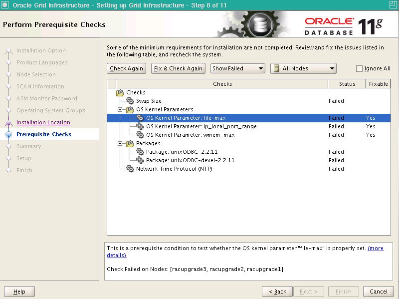 The prerequisites check is a lot better here-in previous versions OUI wouldn’t recognise if you changed kernel parameters. In 11.2 you not only don’t have to change the parameters yourself, but Oracle can validate a second time. So run the fixup script on the node(s) where necessary and try again. I usually ignore the warning about UnixODBC: