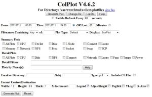 If you like, you can instruct colplot to narrow down the files to be plotted by editing “filenames containing”. If the plotfiles directory contains information to satisfy the period/names you are interested in, it will plot it after a click on “Generate plot”. I suggest a display of “SysPlot” initially, which plots the systems recorded in the colplot files side by side. This is very useful for comparison of system health, especially in clusters. You should experiment with the different plot settings, which are very useful to do all sorts of analysis and allow aggregation on days, system and plots and various combinations of these. By the way the system name is derviced from the hostname when using the colplot -P -f /path/to/plotfiles/ … command.