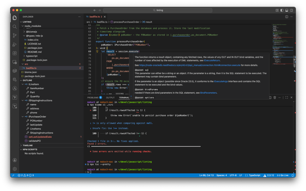 The easiest way to generate good code right from the beginning is to include support for these right from the get-go. Instead of focusing on JavaScript as in the previous posts, this one is about Typescript. Just as with node, you cannot use Typescript directly with Oracle AI Database, you need to transpile it to JavaScript first. The developer experience with Typescript is potentially better since Typescript can warn you of unexpected things before they happen as you can see in this article.