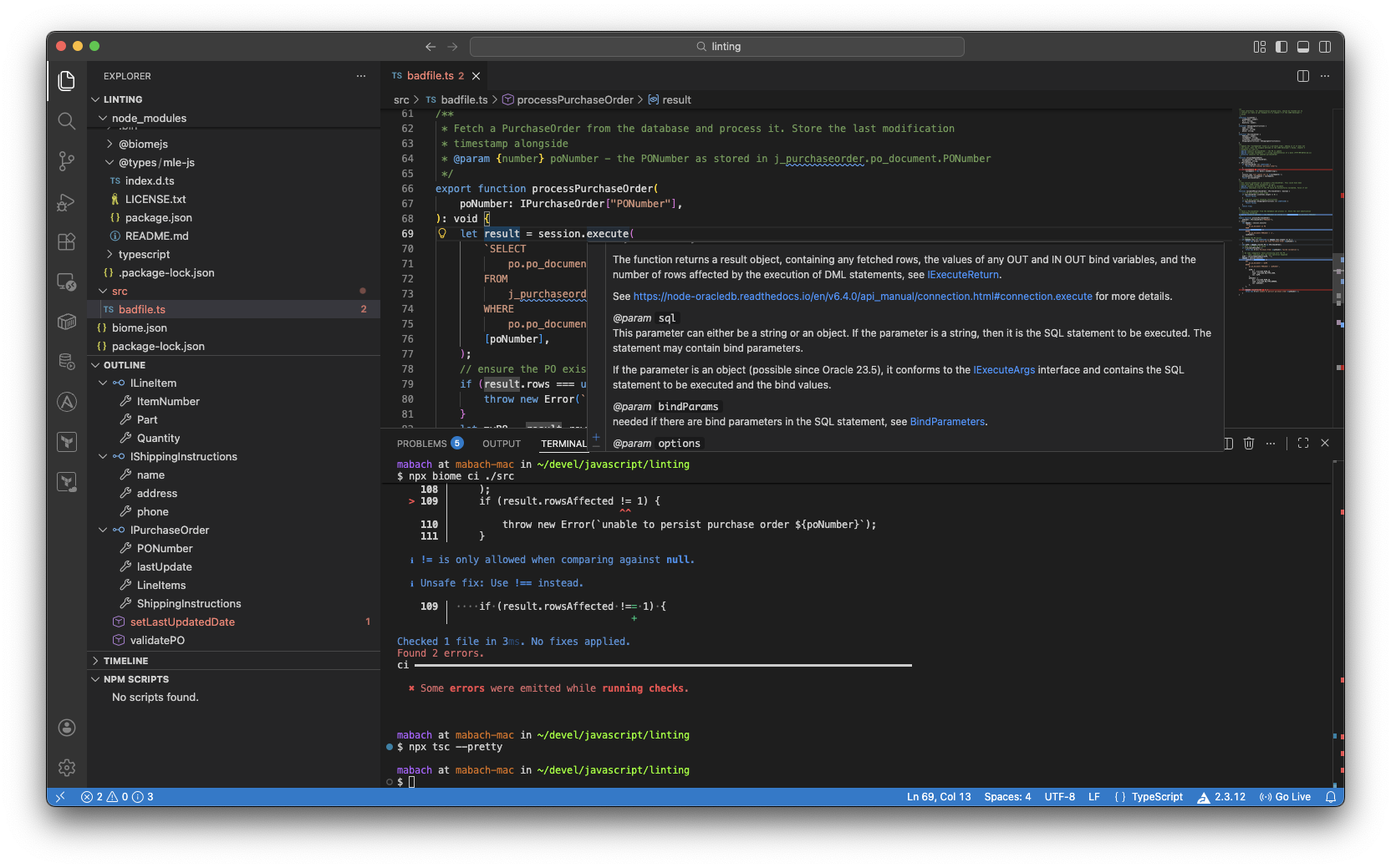 $ npx tsc --pretty falsesrc/goodFile.ts(9,29): error TS7006: Parameter 'purchaseOrder' implicitly has an 'any' type.src/goodFile.ts(9,44): error TS7006: Parameter 'lastUpdate' implicitly has an 'any' type.src/goodFile.ts(26,21): error TS7006: Parameter 'purchaseOrder' implicitly has an 'any' type.src/goodFile.ts(42,38): error TS7006: Parameter 'poNumber' implicitly has an 'any' type.src/goodFile.ts(51,9): error TS2559: Type '" thisIsAnIncorrectParameter "' has no properties in common with type 'IExecuteOptions'.src/goodFile.ts(60,21): error TS2304: Cannot find name 'myPO'.src/goodFile.ts(65,5): error TS2304: Cannot find name 'myPO'.src/goodFile.ts(65,31): error TS2304: Cannot find name 'myPO'.src/goodFile.ts(66,5): error TS2588: Cannot assign to 'result' because it is a constant.src/goodFile.ts(76,22): error TS2304: Cannot find name 'myPO'.
