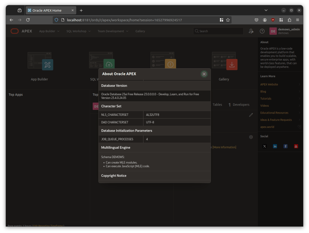 APEX makes it very easy for developers to use MLE: when you create a new workspace you have the option to let APEX create a new schema for you, or use an existing one. Should you decide to let APEX generate the workspace schema, the necessary privileges for using MLE are already granted, and you’re good to go.