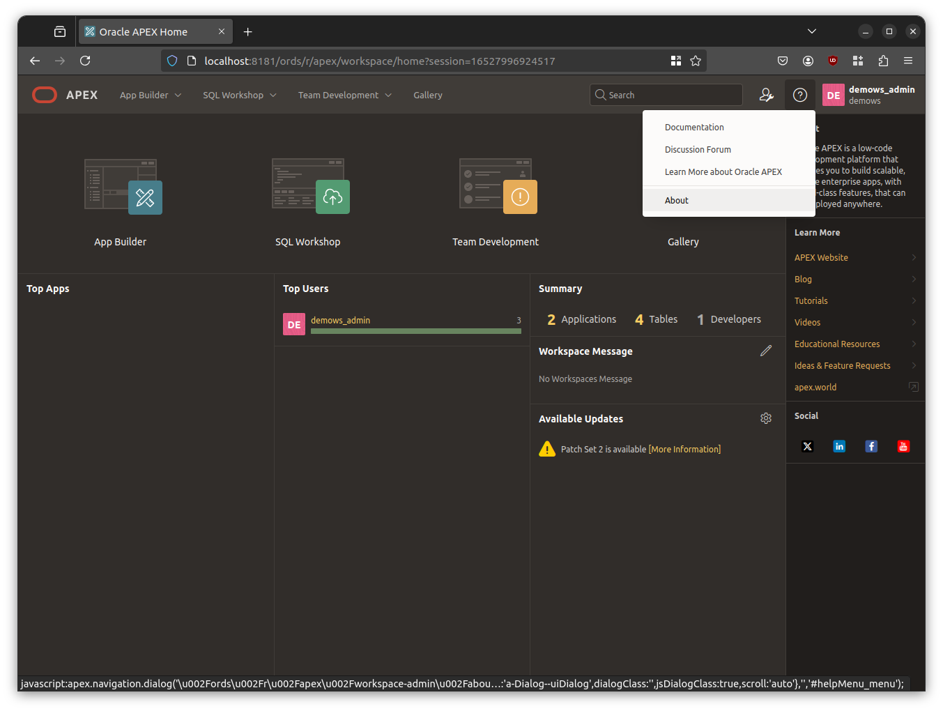 The Help > About menu entry provides a quick way to test if your workspace is MLE-enabled. Left-click the help menu (question mark in a circle) as indicated in the screenshot, then select About.