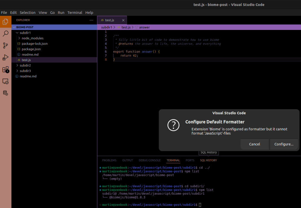 Biome is one of my favourite JavaScript development tools. It comes with an extension that integrates nicely with Visual Studio Code, currently my editor of choice. The VSCode extension assumes that Biome is present at the project’s root directory, which is fine most of the time.