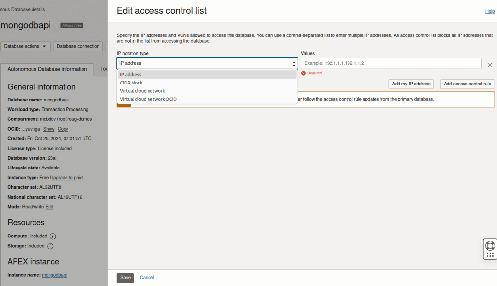 Switch back to Autonomous Database information and check the Access Control List details. If your database has been created using the properties laid out earlier, it will read disabled. Next, click on edit to create an ACL – which is something you might want to do with every Autonomous Database instance that isn’t located in a private subnet, thus inaccessible to the outside world. Better to be safe than sorry.
