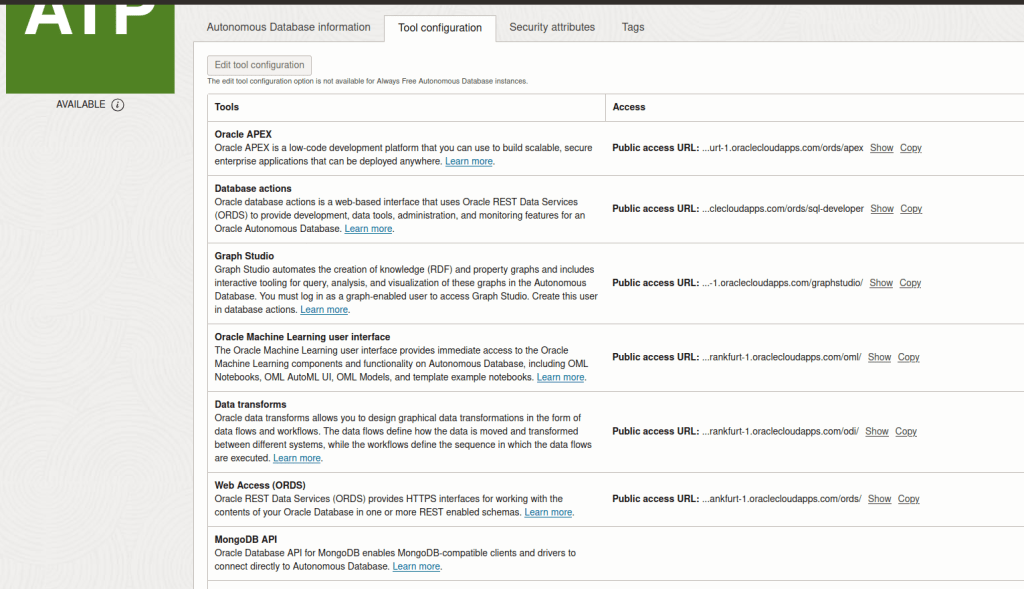 For most Autonomous Databases the MongoDB API is already available with the URL published in the database’s Tool Configuration tab. If you cannot see the URL, please read on.
