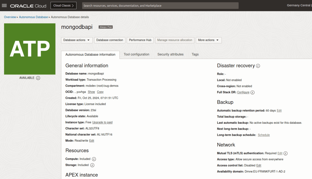if you cannot see the MongoDB API URL displayed in the database’s Tool configuration tab, chances are you have created an Autonomous Database-Serverless (ADB-S) instance using the following properties: