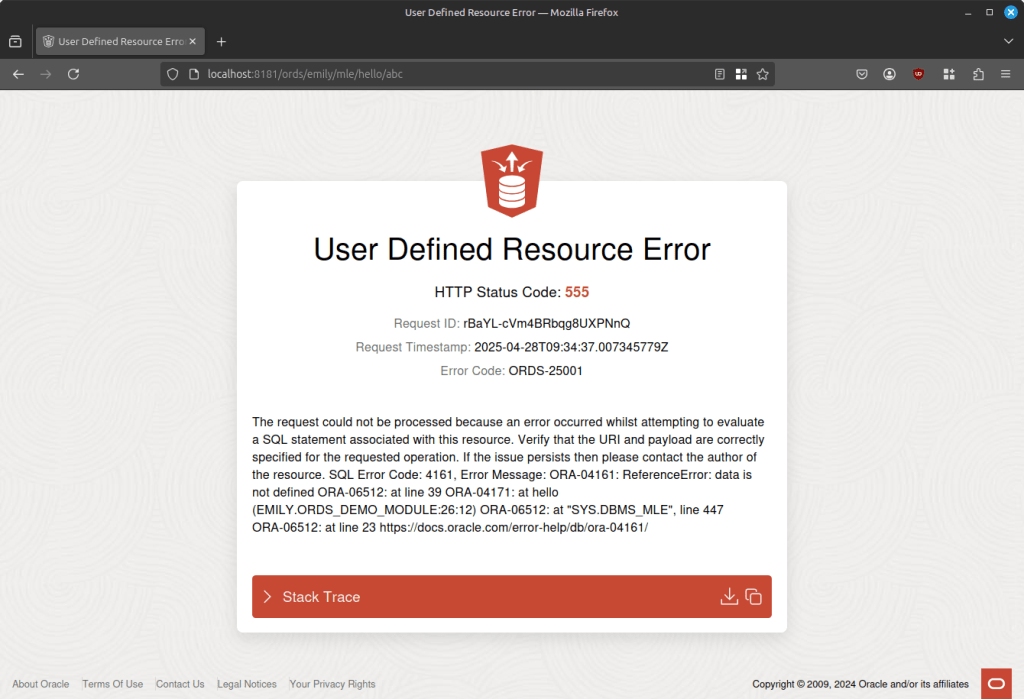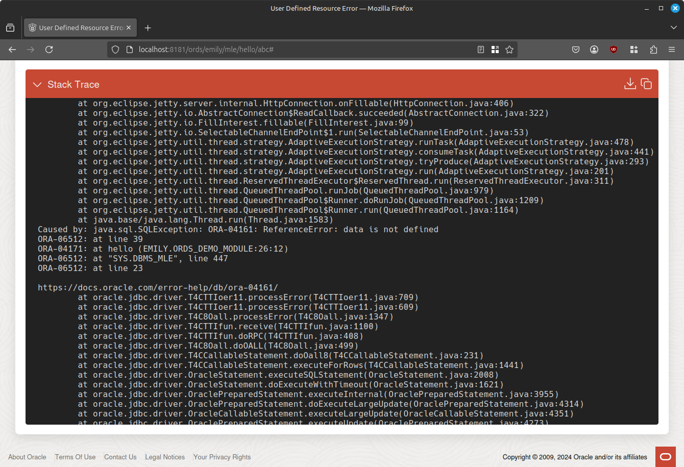 If the error message shown above doesn’t provide the answers you need, you can dig deeper by expanding the stack trace. It contains a wealth of information, including the actual invocation of DBMS_MLE.