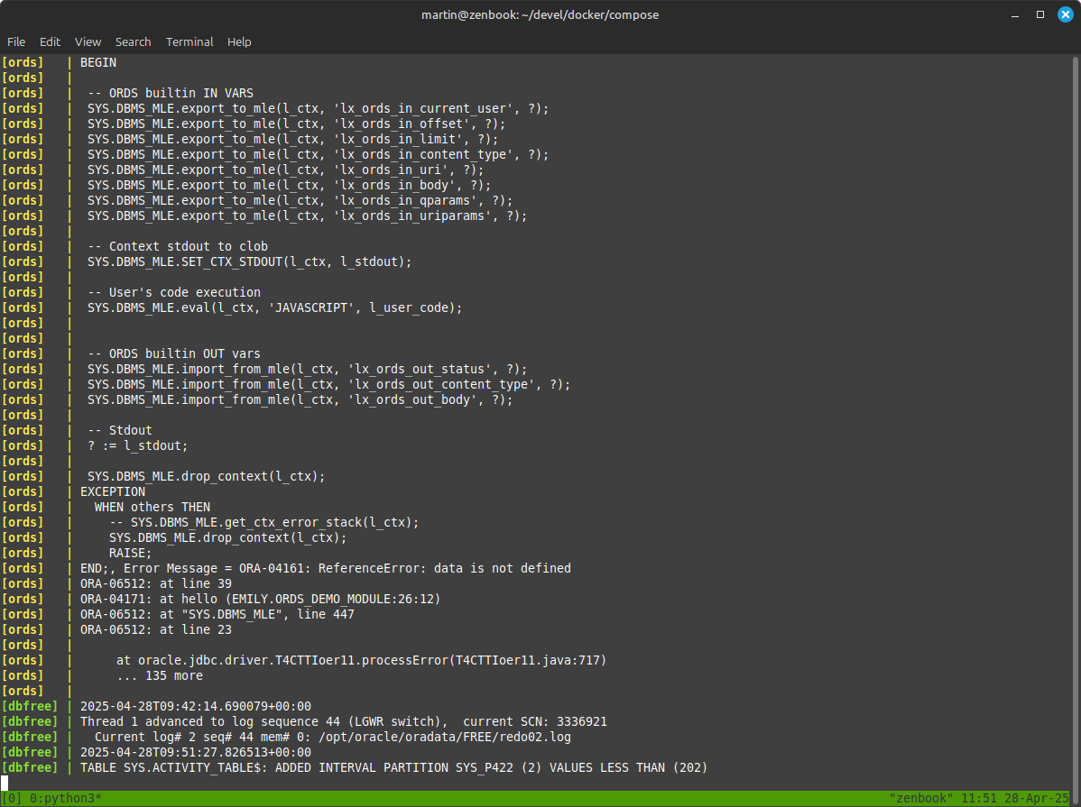 The combination of database and ORDS is started via podman-compose, as described on my GitHub. If you didn’t start your development environment in the foreground, use {podman,docker} logs <container name> to get the ORDS logs
