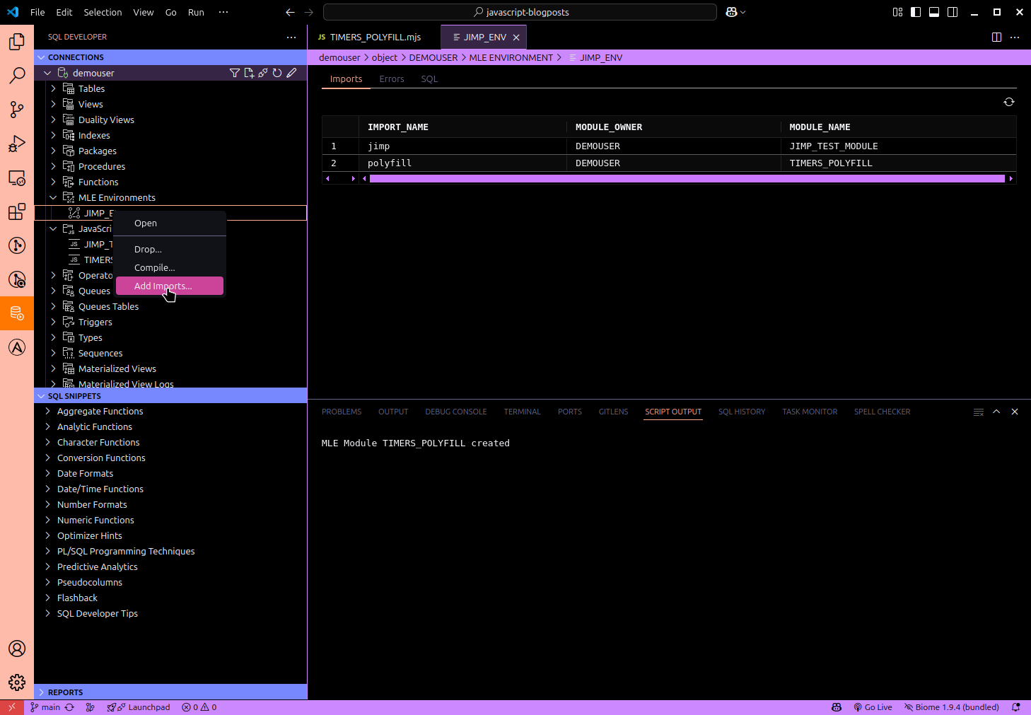The same create/compile invalid/compile all options are available to you after a right-click on MLE Environments. Existing environments can be dropped (please be very careful with that!!!) and modified. Opening an environment takes you to the mapping of import names to modules. A right-click on the environment name allows you to add a new import to the environment.