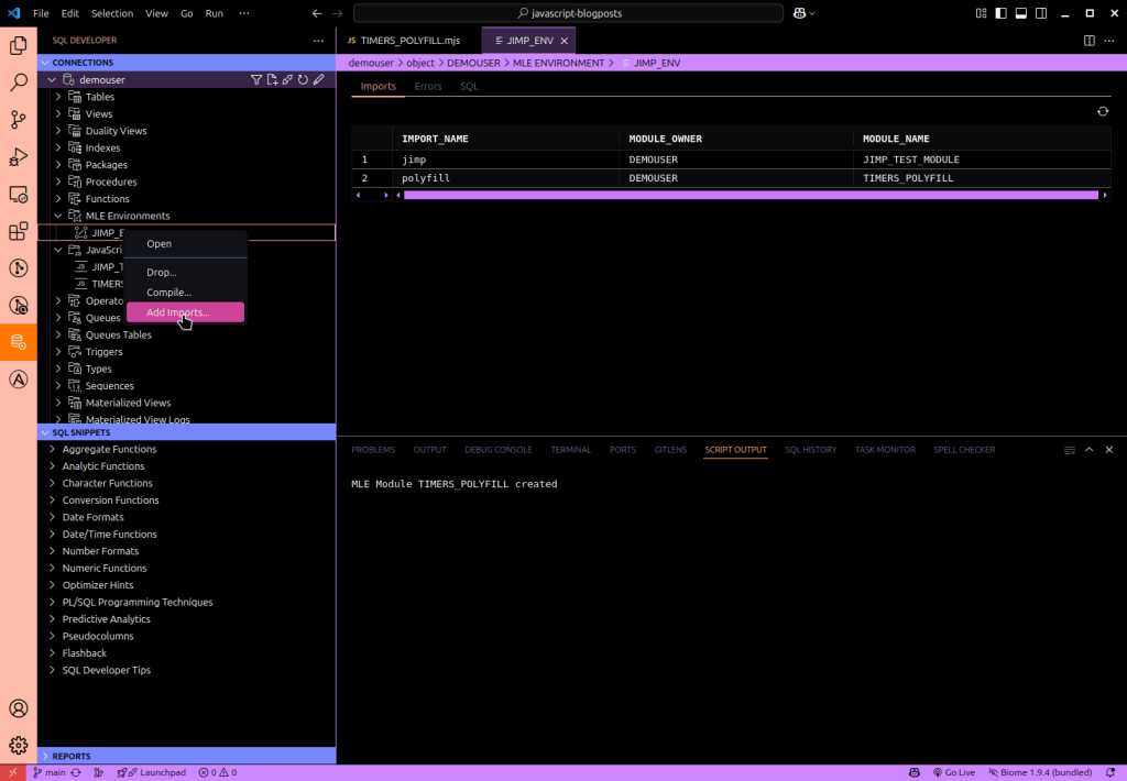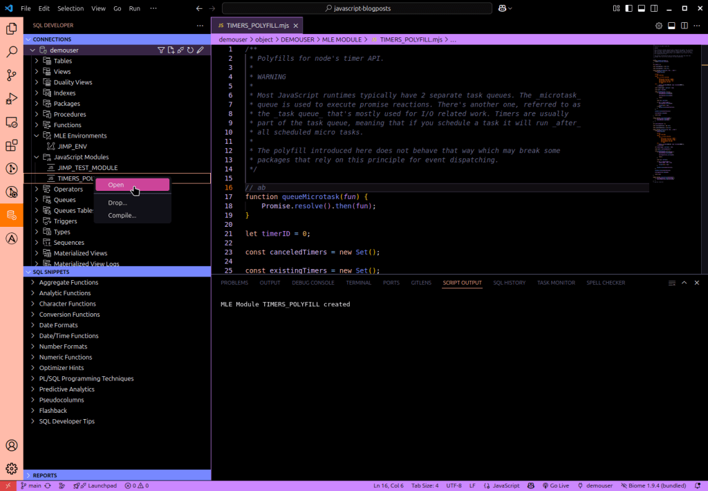 The latest Oracle SQL Developer Extension for VSCode release features an important update for In-Database JavaScript developers: beginning with version 25.1.1 you can create, modify, and drop JavaScript modules and environments.