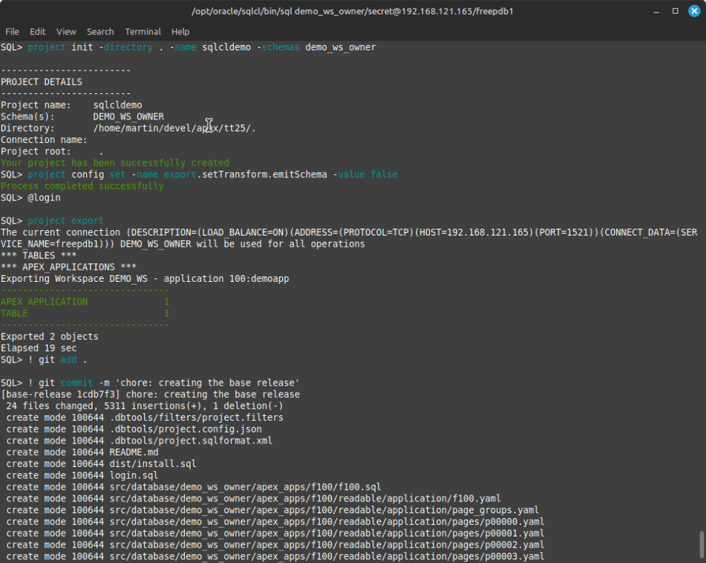 Still in SQLcl, connected as DEMO_WS_OWNER to freepdb1, you begin by initialising the SQLcl project. If you cloned the repository from GitHub, make sure you’re in the top level directory tt25, then run these commands