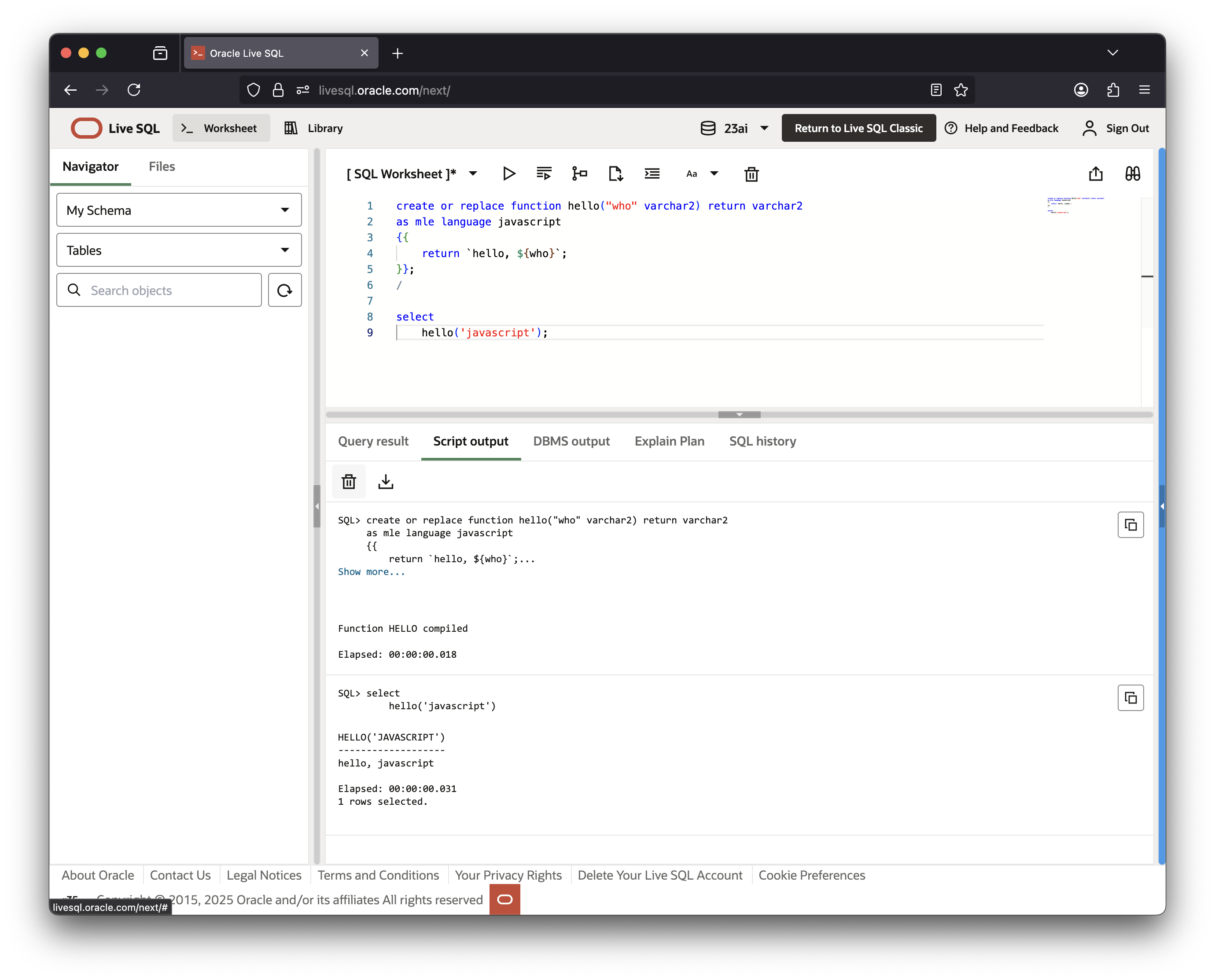 The other one I would like to mention support for In-Database JavaScript, powered by Multilingual Engine (MLE), in LiveSQL. This is a great feature for anyone who wants to get his or her feet wet in the latest server-side development language.