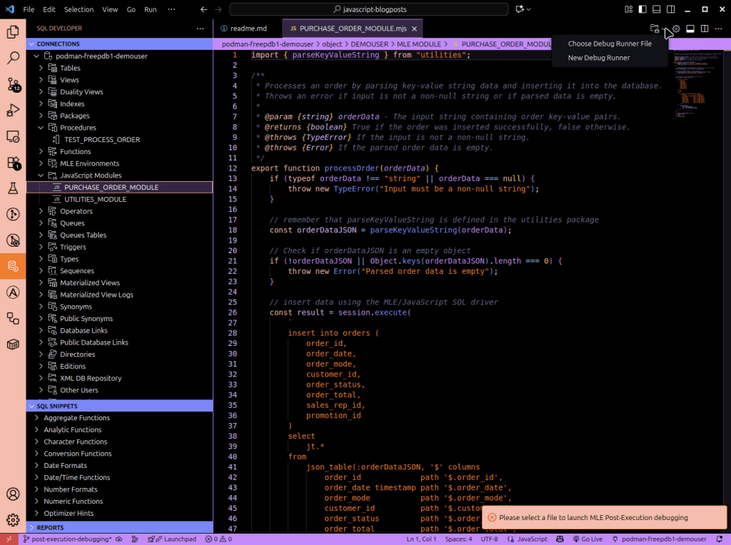 You can either select an existing file as the debug runner (test-debugrunner.sql is a suitable candidate) or create your own. Let’s use the existing one to save ourselves some time. All it does is import the processOrder function from the purchase_order_module and execute it. As per the JSDoc, it requires a delimited string as input, and it will insert the data into the orders table.