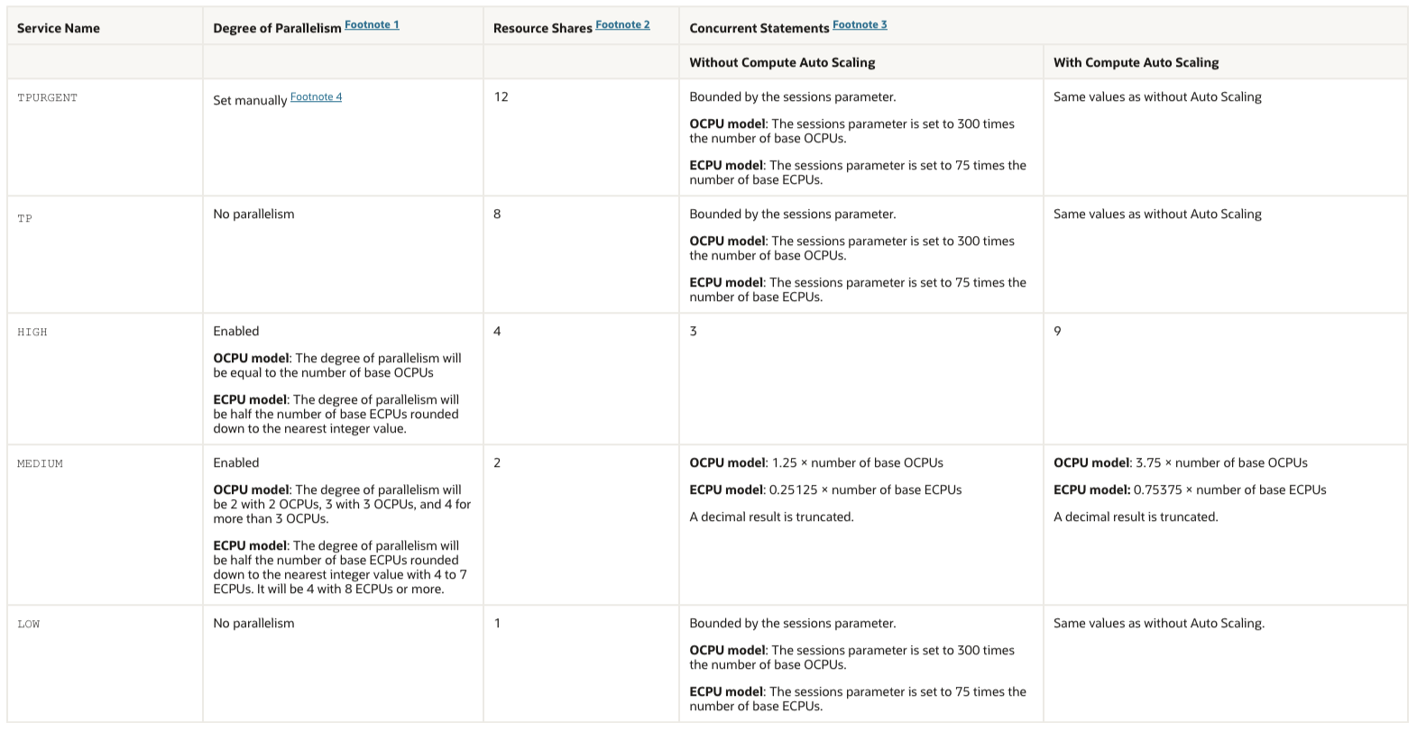 databaseName_high is one of the predefined service names in Autonomous Database, and that’s a pretty awesome concept. Here’s the table containing the details about PX and concurrency with predefined service names in Autonomous Database-Serverless. It might get out of date over time, so make sure you check the source.