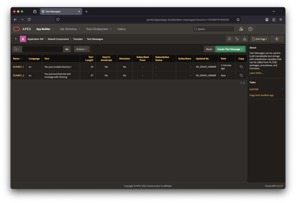 Let’s try to get the English message in application 104. As you can see in the screenshot I defined DUMMY_1 and DUMMY_2 in the application’s shared components in English.