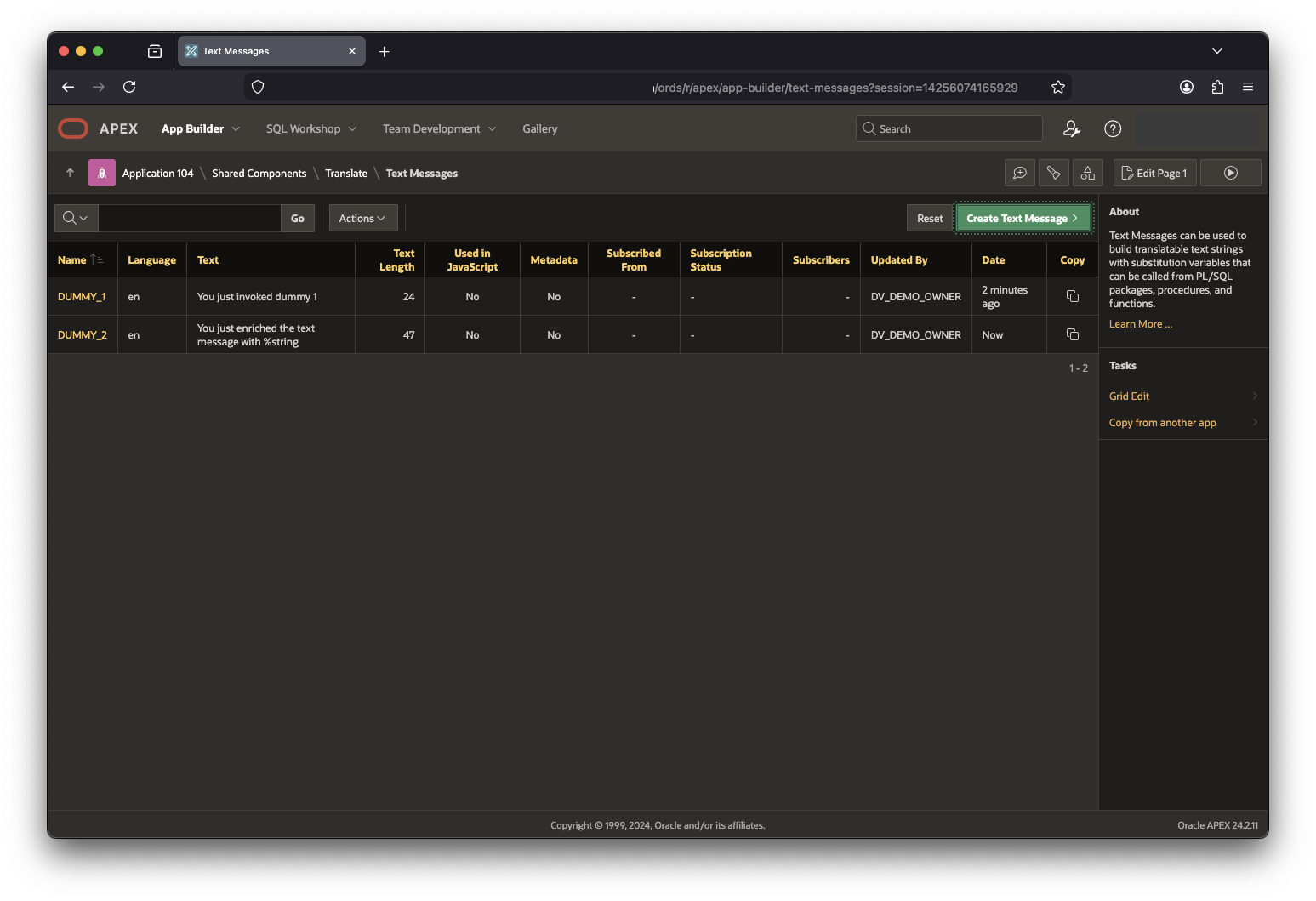 Let’s try to get the English message in application 104. As you can see in the screenshot I defined DUMMY_1 and DUMMY_2 in the application’s shared components in English.
