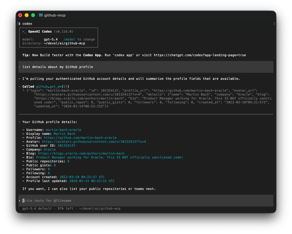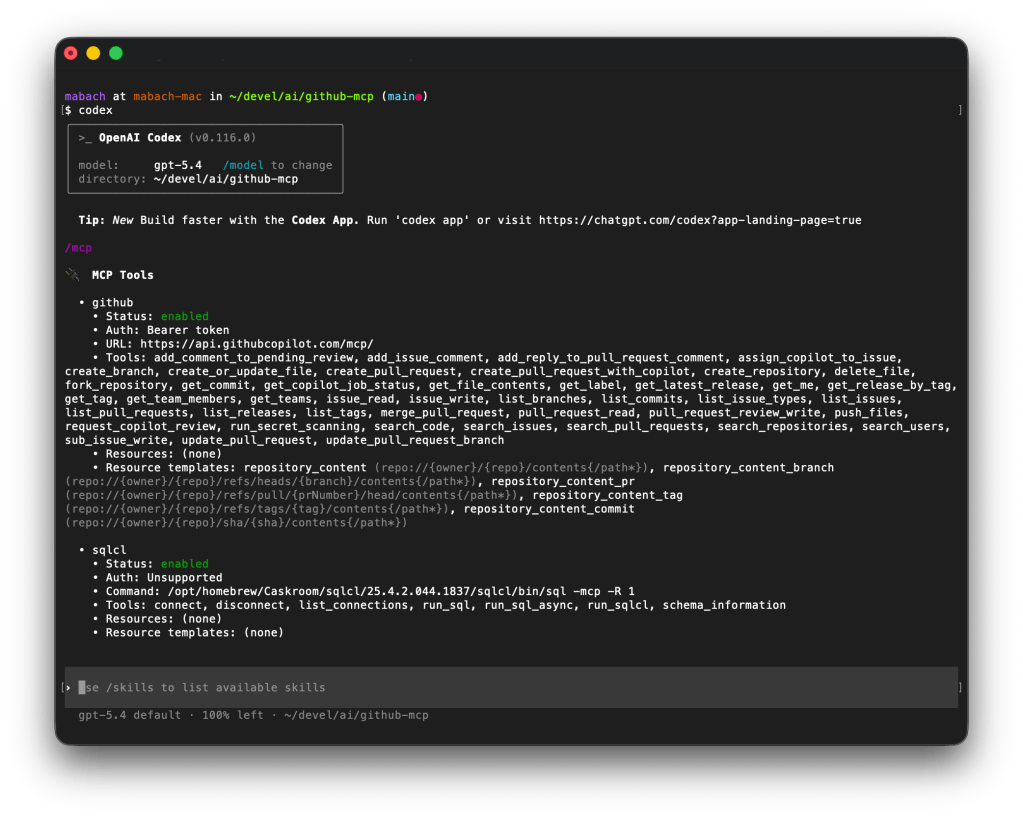 That is it. From there, you can interact with Codex, the GitHub MCP Server, and everything else as usual.