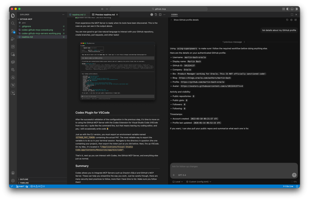 Codex allows you to integrate MCP Servers such as Oracle’s SQLcl and GitHub’s MCP Server. They can help streamline the way you work. Just be careful, though: there are plenty of security best practices to follow, more than I have time to list here. Make sure you adhere to them, and ask if you’re in doubt.
