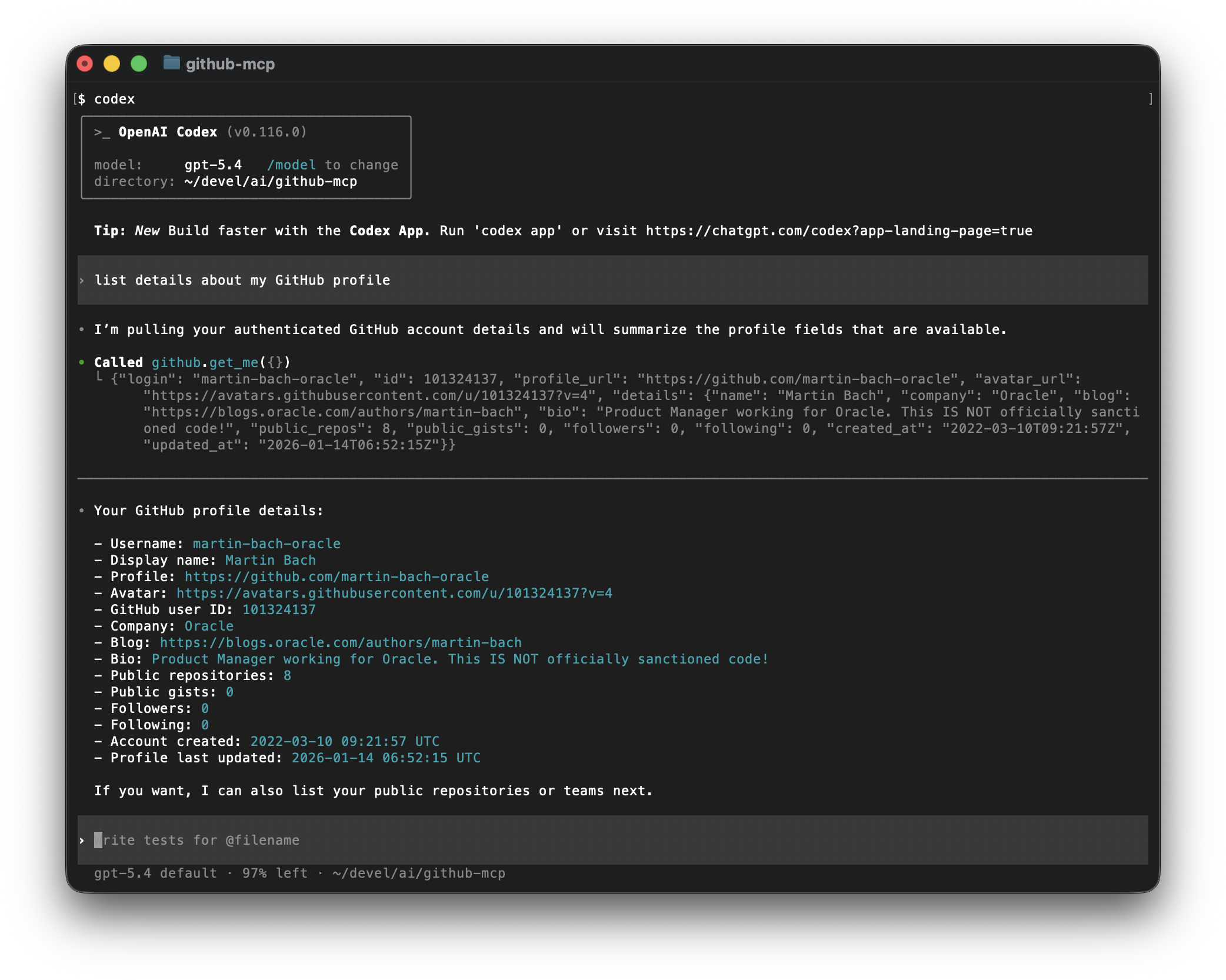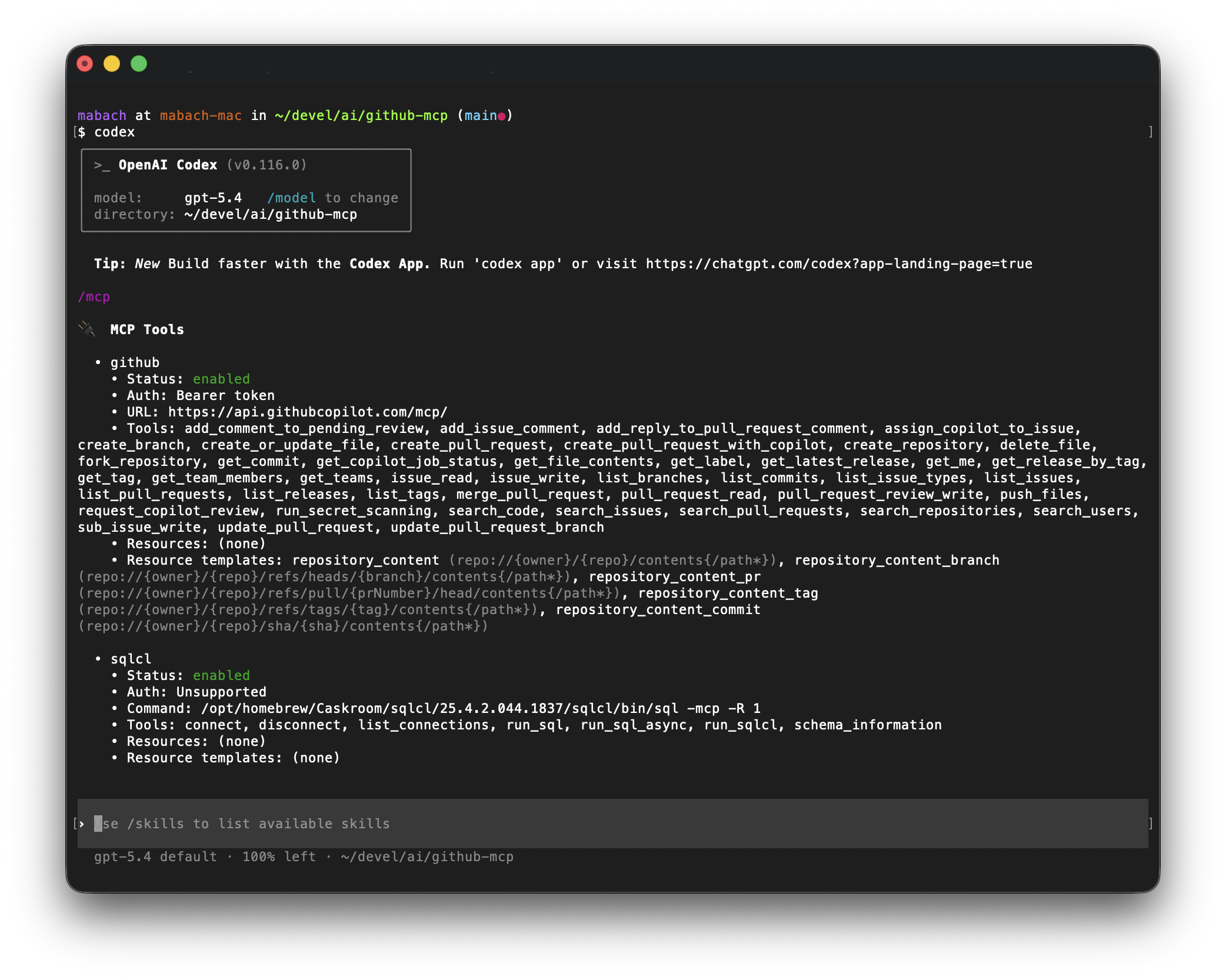 That is it. From there, you can interact with Codex, the GitHub MCP Server, and everything else as usual.
