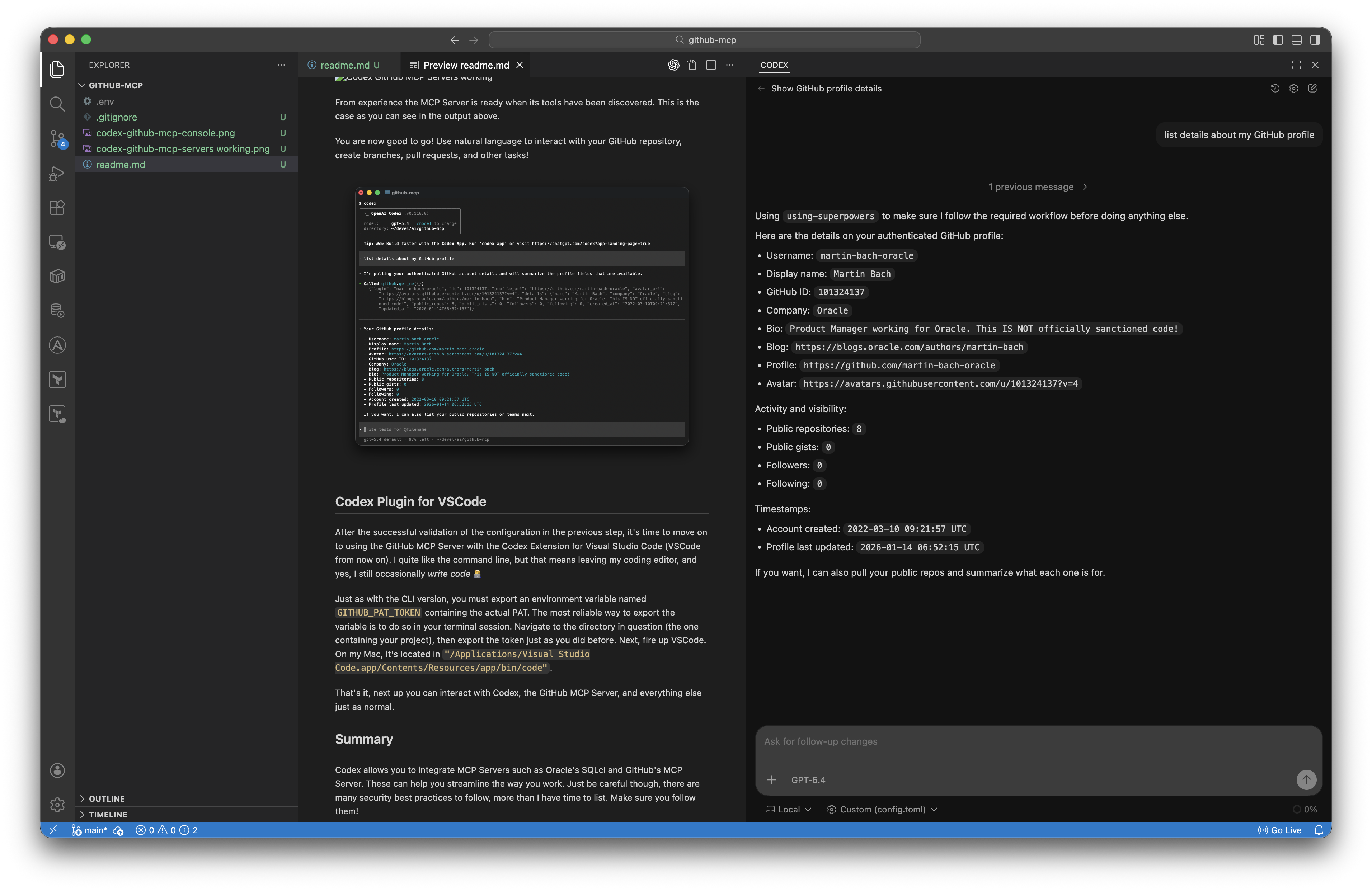 Once you have confirmed that the configuration works, it is time to move on to using the GitHub MCP Server with the Codex extension for Visual Studio Code (VS Code from now on). I quite like the command line, but it does mean leaving my editor, and yes, I still occasionally still write code 🧑💻